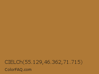CIELCh 55.129,46.362,71.715 Color is a normal orange color and the nearest color is Copper #b87333. Hex code #af7936 and RGB value is rgb(175,121,54). In RGB color space, this color is composed of 69% red, 47% green, 21% blue, In CMYK color space, this color is composed of 0% cyan, 31% magenta, 69% yellow , 31% black , In HSL color space, this color has a hue angle of 33° , 53% saturation and 45% lightness.