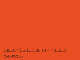 CIELCh 55.137,80.614,43.655 Color is a normal red color and the nearest color is Pomegranate #f34723. Hex code #ea4e23 and RGB value is rgb(234,78,35). In RGB color space, this color is composed of 92% red, 31% green, 14% blue, In CMYK color space, this color is composed of 0% cyan, 67% magenta, 85% yellow , 8% black , In HSL color space, this color has a hue angle of 13° , 83% saturation and 53% lightness.