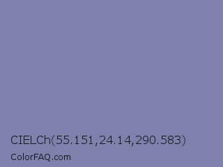 CIELCh 55.151,24.14,290.583 Color is a normal blue color and the nearest color is Shadow Blue #778ba5. Hex code #7e81ab and RGB value is rgb(126,129,171). In RGB color space, this color is composed of 49% red, 51% green, 67% blue, In CMYK color space, this color is composed of 26% cyan, 25% magenta, 0% yellow , 33% black , In HSL color space, this color has a hue angle of 236° , 21% saturation and 58% lightness.