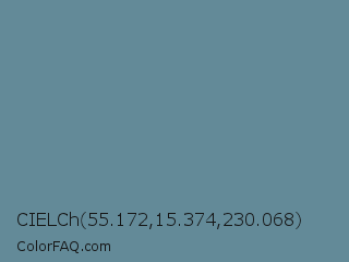CIELCh 55.172,15.374,230.068 Color is a normal blue color and the nearest color is Hoki #65869f. Hex code #638a98 and RGB value is rgb(99,138,152). In RGB color space, this color is composed of 39% red, 54% green, 60% blue, In CMYK color space, this color is composed of 35% cyan, 9% magenta, 0% yellow , 40% black , In HSL color space, this color has a hue angle of 196° , 21% saturation and 49% lightness.