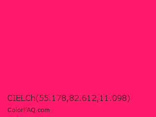 CIELCh 55.178,82.612,11.098 Color is a normal rose color and the nearest color is Vivid Raspberry #ff006c. Hex code #ff1a6d and RGB value is rgb(255,26,109). In RGB color space, this color is composed of 100% red, 10% green, 43% blue, In CMYK color space, this color is composed of 0% cyan, 90% magenta, 57% yellow , 0% black , In HSL color space, this color has a hue angle of 338° , 100% saturation and 55% lightness.