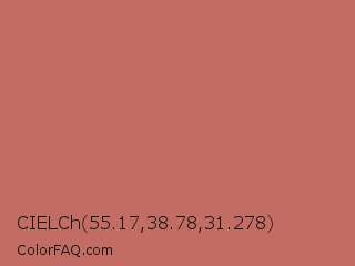 CIELCh 55.17,38.78,31.278 Color is a normal red color and the nearest color is Contessa #c6726b. Hex code #c26c63 and RGB value is rgb(194,108,99). In RGB color space, this color is composed of 76% red, 42% green, 39% blue, In CMYK color space, this color is composed of 0% cyan, 44% magenta, 49% yellow , 24% black , In HSL color space, this color has a hue angle of 6° , 44% saturation and 57% lightness.