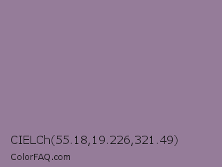 CIELCh 55.18,19.226,321.49 Color is a normal magenta color and the nearest color is Mamba #8e8190. Hex code #957c99 and RGB value is rgb(149,124,153). In RGB color space, this color is composed of 58% red, 49% green, 60% blue, In CMYK color space, this color is composed of 3% cyan, 19% magenta, 0% yellow , 40% black , In HSL color space, this color has a hue angle of 292° , 12% saturation and 54% lightness.