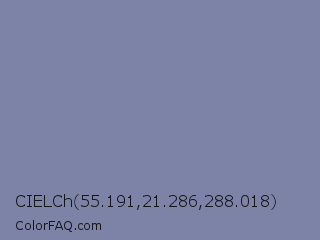 CIELCh 55.191,21.286,288.018 Color is a normal blue color and the nearest color is Shadow Blue #778ba5. Hex code #7d82a7 and RGB value is rgb(125,130,167). In RGB color space, this color is composed of 49% red, 51% green, 65% blue, In CMYK color space, this color is composed of 25% cyan, 22% magenta, 0% yellow , 35% black , In HSL color space, this color has a hue angle of 233° , 19% saturation and 57% lightness.