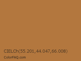 CIELCh 55.201,44.047,66.008 Color is a normal orange color and the nearest color is Copper #b87333. Hex code #b3773e and RGB value is rgb(179,119,62). In RGB color space, this color is composed of 70% red, 47% green, 24% blue, In CMYK color space, this color is composed of 0% cyan, 34% magenta, 65% yellow , 30% black , In HSL color space, this color has a hue angle of 29° , 49% saturation and 47% lightness.