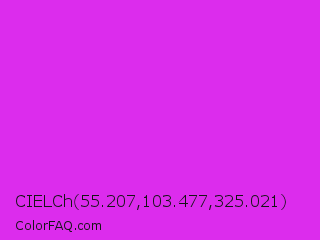 CIELCh 55.207,103.477,325.021 Color is a normal magenta color and the nearest color is Steel Pink #cc33cc. Hex code #dc2ced and RGB value is rgb(220,44,237). In RGB color space, this color is composed of 86% red, 17% green, 93% blue, In CMYK color space, this color is composed of 7% cyan, 81% magenta, 0% yellow , 7% black , In HSL color space, this color has a hue angle of 295° , 84% saturation and 55% lightness.