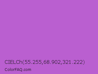 CIELCh 55.255,68.902,321.222 Color is a normal purple color and the nearest color is Rich Lilac #b666d2. Hex code #ba5fd0 and RGB value is rgb(186,95,208). In RGB color space, this color is composed of 73% red, 37% green, 82% blue, In CMYK color space, this color is composed of 11% cyan, 54% magenta, 0% yellow , 18% black , In HSL color space, this color has a hue angle of 288° , 55% saturation and 59% lightness.
