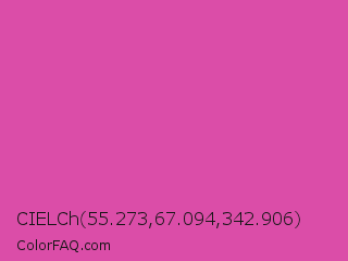 CIELCh 55.273,67.094,342.906 Color is a normal magenta color and the nearest color is Raspberry Pink #e25098. Hex code #db4da8 and RGB value is rgb(219,77,168). In RGB color space, this color is composed of 86% red, 30% green, 66% blue, In CMYK color space, this color is composed of 0% cyan, 65% magenta, 23% yellow , 14% black , In HSL color space, this color has a hue angle of 322° , 66% saturation and 58% lightness.