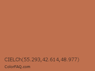 CIELCh 55.293,42.614,48.977 Color is a normal orange color and the nearest color is Copper Red #cb6d51. Hex code #bf704e and RGB value is rgb(191,112,78). In RGB color space, this color is composed of 75% red, 44% green, 31% blue, In CMYK color space, this color is composed of 0% cyan, 41% magenta, 59% yellow , 25% black , In HSL color space, this color has a hue angle of 18° , 47% saturation and 53% lightness.
