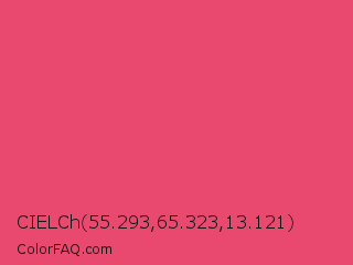 CIELCh 55.293,65.323,13.121 Color is a normal red color and the nearest color is Mandy #e25465. Hex code #e9496e and RGB value is rgb(233,73,110). In RGB color space, this color is composed of 91% red, 29% green, 43% blue, In CMYK color space, this color is composed of 0% cyan, 69% magenta, 53% yellow , 9% black , In HSL color space, this color has a hue angle of 346° , 78% saturation and 60% lightness.