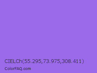 CIELCh 55.295,73.975,308.411 Color is a light violet color and the nearest color is Medium Purple #9370db. Hex code #9b6aea and RGB value is rgb(155,106,234). In RGB color space, this color is composed of 61% red, 42% green, 92% blue, In CMYK color space, this color is composed of 34% cyan, 55% magenta, 0% yellow , 8% black , In HSL color space, this color has a hue angle of 263° , 75% saturation and 67% lightness.