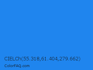 CIELCh 55.318,61.404,279.662 Color is a normal blue color and the nearest color is Dodger Blue #1e90ff. Hex code #1f85ee and RGB value is rgb(31,133,238). In RGB color space, this color is composed of 12% red, 52% green, 93% blue, In CMYK color space, this color is composed of 87% cyan, 44% magenta, 0% yellow , 7% black , In HSL color space, this color has a hue angle of 210° , 86% saturation and 53% lightness.