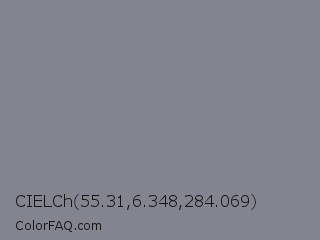 CIELCh 55.31,6.348,284.069 Color is a normal blue color and the nearest color is Roman Silver #838996. Hex code #82848f and RGB value is rgb(130,132,143). In RGB color space, this color is composed of 51% red, 52% green, 56% blue, In CMYK color space, this color is composed of 9% cyan, 8% magenta, 0% yellow , 44% black , In HSL color space, this color has a hue angle of 231° , 5% saturation and 54% lightness.