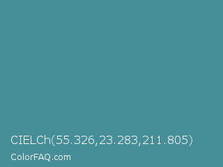 CIELCh 55.326,23.283,211.805 Color is a normal cyan color and the nearest color is Wedgewood #4e7f9e. Hex code #468f99 and RGB value is rgb(70,143,153). In RGB color space, this color is composed of 27% red, 56% green, 60% blue, In CMYK color space, this color is composed of 54% cyan, 7% magenta, 0% yellow , 40% black , In HSL color space, this color has a hue angle of 187° , 37% saturation and 44% lightness.