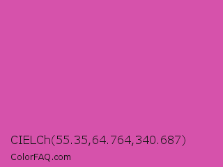 CIELCh 55.35,64.764,340.687 Color is a normal magenta color and the nearest color is Raspberry Pink #e25098. Hex code #d652ab and RGB value is rgb(214,82,171). In RGB color space, this color is composed of 84% red, 32% green, 67% blue, In CMYK color space, this color is composed of 0% cyan, 62% magenta, 20% yellow , 16% black , In HSL color space, this color has a hue angle of 320° , 62% saturation and 58% lightness.
