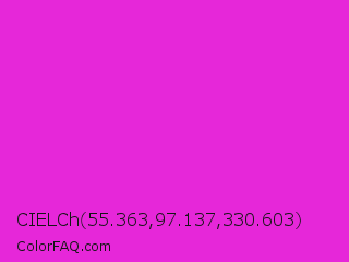 CIELCh 55.363,97.137,330.603 Color is a normal magenta color and the nearest color is Hot Magenta #ff1dce. Hex code #e627d9 and RGB value is rgb(230,39,217). In RGB color space, this color is composed of 90% red, 15% green, 85% blue, In CMYK color space, this color is composed of 0% cyan, 83% magenta, 6% yellow , 10% black , In HSL color space, this color has a hue angle of 304° , 79% saturation and 53% lightness.
