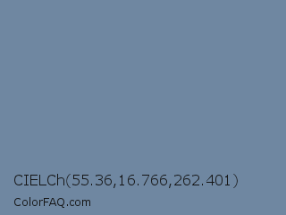 CIELCh 55.36,16.766,262.401 Color is a normal blue color and the nearest color is Bermuda Gray #6b8ba2. Hex code #6f87a1 and RGB value is rgb(111,135,161). In RGB color space, this color is composed of 44% red, 53% green, 63% blue, In CMYK color space, this color is composed of 31% cyan, 16% magenta, 0% yellow , 37% black , In HSL color space, this color has a hue angle of 211° , 21% saturation and 53% lightness.