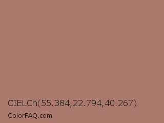 CIELCh 55.384,22.794,40.267 Color is a normal red color and the nearest color is Copper Penny #ad6f69. Hex code #aa796c and RGB value is rgb(170,121,108). In RGB color space, this color is composed of 67% red, 47% green, 42% blue, In CMYK color space, this color is composed of 0% cyan, 29% magenta, 36% yellow , 33% black , In HSL color space, this color has a hue angle of 13° , 27% saturation and 55% lightness.