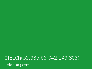 CIELCh 55.385,65.942,143.303 Color is a normal green color and the nearest color is North Texas Green #059033. Hex code #19993b and RGB value is rgb(25,153,59). In RGB color space, this color is composed of 10% red, 60% green, 23% blue, In CMYK color space, this color is composed of 84% cyan, 0% magenta, 61% yellow , 40% black , In HSL color space, this color has a hue angle of 136° , 72% saturation and 35% lightness.