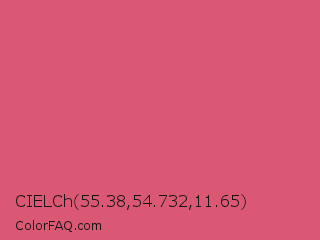 CIELCh 55.38,54.732,11.65 Color is a normal red color and the nearest color is Cranberry #db5079. Hex code #db5874 and RGB value is rgb(219,88,116). In RGB color space, this color is composed of 86% red, 35% green, 45% blue, In CMYK color space, this color is composed of 0% cyan, 60% magenta, 47% yellow , 14% black , In HSL color space, this color has a hue angle of 347° , 65% saturation and 60% lightness.