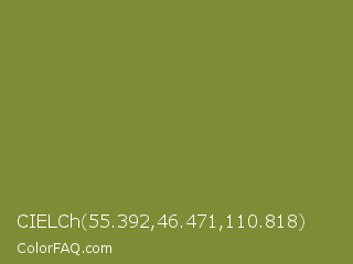CIELCh 55.392,46.471,110.818 Color is a normal yellow color and the nearest color is Old Moss Green #867e36. Hex code #808b35 and RGB value is rgb(128,139,53). In RGB color space, this color is composed of 50% red, 55% green, 21% blue, In CMYK color space, this color is composed of 8% cyan, 0% magenta, 62% yellow , 45% black , In HSL color space, this color has a hue angle of 68° , 45% saturation and 38% lightness.