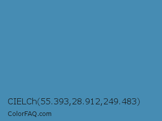 CIELCh 55.393,28.912,249.483 Color is a normal blue color and the nearest color is Steel Blue #4682b4. Hex code #468cb3 and RGB value is rgb(70,140,179). In RGB color space, this color is composed of 27% red, 55% green, 70% blue, In CMYK color space, this color is composed of 61% cyan, 22% magenta, 0% yellow , 30% black , In HSL color space, this color has a hue angle of 201° , 44% saturation and 49% lightness.