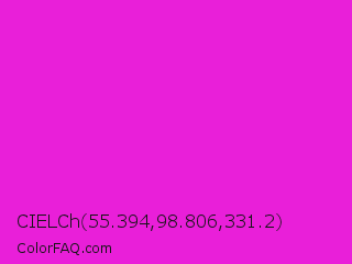 CIELCh 55.394,98.806,331.2 Color is a normal magenta color and the nearest color is Hot Magenta #ff1dce. Hex code #e91fd9 and RGB value is rgb(233,31,217). In RGB color space, this color is composed of 91% red, 12% green, 85% blue, In CMYK color space, this color is composed of 0% cyan, 87% magenta, 7% yellow , 9% black , In HSL color space, this color has a hue angle of 305° , 82% saturation and 52% lightness.