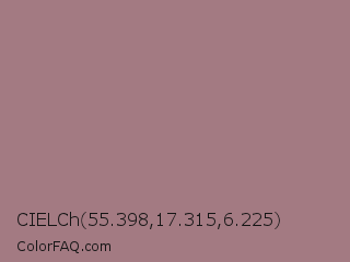 CIELCh 55.398,17.315,6.225 Color is a normal red color and the nearest color is Pharlap #a3807b. Hex code #a37a82 and RGB value is rgb(163,122,130). In RGB color space, this color is composed of 64% red, 48% green, 51% blue, In CMYK color space, this color is composed of 0% cyan, 25% magenta, 20% yellow , 36% black , In HSL color space, this color has a hue angle of 348° , 18% saturation and 56% lightness.