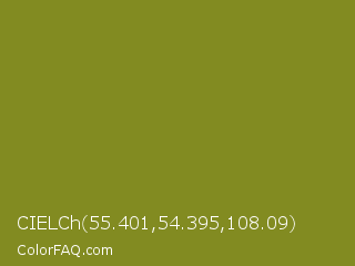CIELCh 55.401,54.395,108.09 Color is a normal yellow color and the nearest color is Trendy Green #7c881a. Hex code #828b21 and RGB value is rgb(130,139,33). In RGB color space, this color is composed of 51% red, 55% green, 13% blue, In CMYK color space, this color is composed of 6% cyan, 0% magenta, 76% yellow , 45% black , In HSL color space, this color has a hue angle of 65° , 62% saturation and 34% lightness.