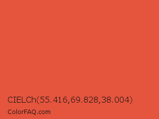 CIELCh 55.416,69.828,38.004 Color is a normal red color and the nearest color is Carmine Pink #eb4c42. Hex code #e5543d and RGB value is rgb(229,84,61). In RGB color space, this color is composed of 90% red, 33% green, 24% blue, In CMYK color space, this color is composed of 0% cyan, 63% magenta, 73% yellow , 10% black , In HSL color space, this color has a hue angle of 8° , 76% saturation and 57% lightness.