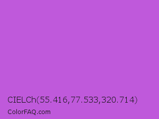 CIELCh 55.416,77.533,320.714 Color is a normal purple color and the nearest color is Medium Orchid #ba55d3. Hex code #bf59db and RGB value is rgb(191,89,219). In RGB color space, this color is composed of 75% red, 35% green, 86% blue, In CMYK color space, this color is composed of 13% cyan, 59% magenta, 0% yellow , 14% black , In HSL color space, this color has a hue angle of 287° , 64% saturation and 60% lightness.