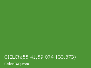 CIELCh 55.41,59.074,133.873 Color is a normal green color and the nearest color is May Green #4c9141. Hex code #4d9535 and RGB value is rgb(77,149,53). In RGB color space, this color is composed of 30% red, 58% green, 21% blue, In CMYK color space, this color is composed of 48% cyan, 0% magenta, 64% yellow , 42% black , In HSL color space, this color has a hue angle of 105° , 48% saturation and 40% lightness.