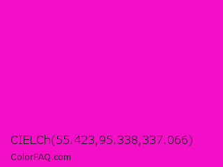 CIELCh 55.423,95.338,337.066 Color is a normal magenta color and the nearest color is Shocking Pink #fc0fc0. Hex code #f20fc7 and RGB value is rgb(242,15,199). In RGB color space, this color is composed of 95% red, 6% green, 78% blue, In CMYK color space, this color is composed of 0% cyan, 94% magenta, 18% yellow , 5% black , In HSL color space, this color has a hue angle of 311° , 90% saturation and 50% lightness.