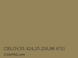 CIELCh 55.424,25.226,88.672 Color is a normal orange color and the nearest color is Dark Tan #918151. Hex code #958359 and RGB value is rgb(149,131,89). In RGB color space, this color is composed of 58% red, 51% green, 35% blue, In CMYK color space, this color is composed of 0% cyan, 12% magenta, 40% yellow , 42% black , In HSL color space, this color has a hue angle of 42° , 25% saturation and 47% lightness.