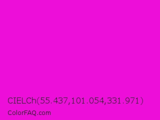 CIELCh 55.437,101.054,331.971 Color is a normal magenta color and the nearest color is Hot Magenta #ff1dce. Hex code #ed0fd9 and RGB value is rgb(237,15,217). In RGB color space, this color is composed of 93% red, 6% green, 85% blue, In CMYK color space, this color is composed of 0% cyan, 94% magenta, 8% yellow , 7% black , In HSL color space, this color has a hue angle of 305° , 88% saturation and 49% lightness.