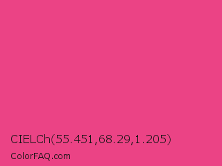 CIELCh 55.451,68.29,1.205 Color is a normal rose color and the nearest color is Cerise Pink #ec3b83. Hex code #eb4385 and RGB value is rgb(235,67,133). In RGB color space, this color is composed of 92% red, 26% green, 52% blue, In CMYK color space, this color is composed of 0% cyan, 71% magenta, 43% yellow , 8% black , In HSL color space, this color has a hue angle of 336° , 81% saturation and 59% lightness.