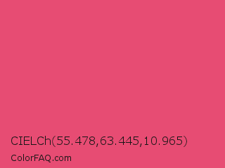 CIELCh 55.478,63.445,10.965 Color is a normal red color and the nearest color is Cranberry #db5079. Hex code #e74c73 and RGB value is rgb(231,76,115). In RGB color space, this color is composed of 91% red, 30% green, 45% blue, In CMYK color space, this color is composed of 0% cyan, 67% magenta, 50% yellow , 9% black , In HSL color space, this color has a hue angle of 345° , 76% saturation and 60% lightness.