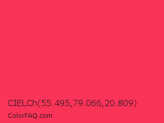 CIELCh 55.495,79.066,20.809 Color is a normal red color and the nearest color is Radical Red #ff355e. Hex code #fa3359 and RGB value is rgb(250,51,89). In RGB color space, this color is composed of 98% red, 20% green, 35% blue, In CMYK color space, this color is composed of 0% cyan, 80% magenta, 64% yellow , 2% black , In HSL color space, this color has a hue angle of 349° , 95% saturation and 59% lightness.