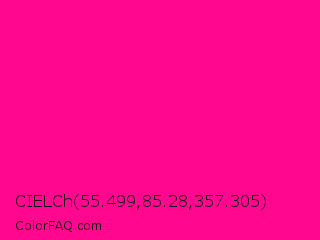 CIELCh 55.499,85.28,357.305 Color is a normal magenta color and the nearest color is Magenta Process #ff0090. Hex code #ff088f and RGB value is rgb(255,8,143). In RGB color space, this color is composed of 100% red, 3% green, 56% blue, In CMYK color space, this color is composed of 0% cyan, 97% magenta, 44% yellow , 0% black , In HSL color space, this color has a hue angle of 327° , 100% saturation and 52% lightness.