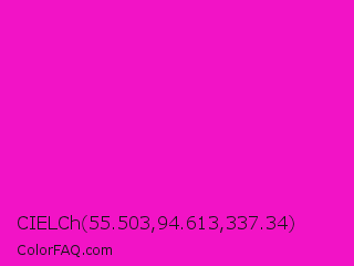 CIELCh 55.503,94.613,337.34 Color is a normal magenta color and the nearest color is Shocking Pink #fc0fc0. Hex code #f213c6 and RGB value is rgb(242,19,198). In RGB color space, this color is composed of 95% red, 7% green, 78% blue, In CMYK color space, this color is composed of 0% cyan, 92% magenta, 18% yellow , 5% black , In HSL color space, this color has a hue angle of 312° , 90% saturation and 51% lightness.