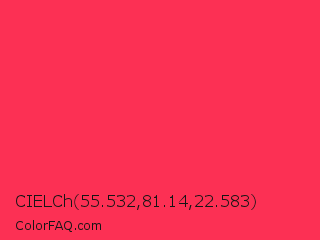 CIELCh 55.532,81.14,22.583 Color is a normal red color and the nearest color is Sizzling Red #ff3855. Hex code #fc3054 and RGB value is rgb(252,48,84). In RGB color space, this color is composed of 99% red, 19% green, 33% blue, In CMYK color space, this color is composed of 0% cyan, 81% magenta, 67% yellow , 1% black , In HSL color space, this color has a hue angle of 349° , 97% saturation and 59% lightness.