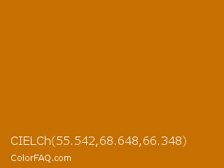 CIELCh 55.542,68.648,66.348 Color is a normal orange color and the nearest color is Indochine #c26b03. Hex code #c57000 and RGB value is rgb(197,112,0). In RGB color space, this color is composed of 77% red, 44% green, 0% blue, In CMYK color space, this color is composed of 0% cyan, 43% magenta, 100% yellow , 23% black , In HSL color space, this color has a hue angle of 34° , 100% saturation and 39% lightness.