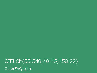 CIELCh 55.548,40.15,158.22 Color is a normal green color and the nearest color is Illuminating Emerald #319177. Hex code #3b956a and RGB value is rgb(59,149,106). In RGB color space, this color is composed of 23% red, 58% green, 42% blue, In CMYK color space, this color is composed of 60% cyan, 0% magenta, 29% yellow , 42% black , In HSL color space, this color has a hue angle of 151° , 43% saturation and 41% lightness.