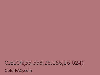 CIELCh 55.558,25.256,16.024 Color is a normal red color and the nearest color is Turkish Rose #b57281. Hex code #b1757a and RGB value is rgb(177,117,122). In RGB color space, this color is composed of 69% red, 46% green, 48% blue, In CMYK color space, this color is composed of 0% cyan, 34% magenta, 31% yellow , 31% black , In HSL color space, this color has a hue angle of 355° , 28% saturation and 58% lightness.