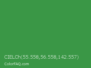 CIELCh 55.558,56.558,142.557 Color is a normal green color and the nearest color is May Green #4c9141. Hex code #3a9746 and RGB value is rgb(58,151,70). In RGB color space, this color is composed of 23% red, 59% green, 27% blue, In CMYK color space, this color is composed of 62% cyan, 0% magenta, 54% yellow , 41% black , In HSL color space, this color has a hue angle of 128° , 44% saturation and 41% lightness.