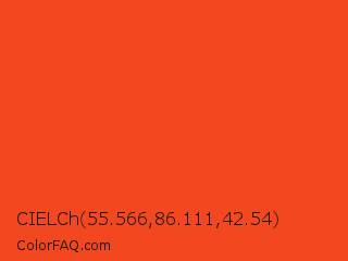 CIELCh 55.566,86.111,42.54 Color is a normal red color and the nearest color is Pomegranate #f34723. Hex code #f2471f and RGB value is rgb(242,71,31). In RGB color space, this color is composed of 95% red, 28% green, 12% blue, In CMYK color space, this color is composed of 0% cyan, 71% magenta, 87% yellow , 5% black , In HSL color space, this color has a hue angle of 11° , 89% saturation and 54% lightness.