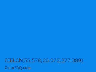 CIELCh 55.578,60.072,277.389 Color is a normal blue color and the nearest color is Azure Radiance #007fff. Hex code #0887ed and RGB value is rgb(8,135,237). In RGB color space, this color is composed of 3% red, 53% green, 93% blue, In CMYK color space, this color is composed of 97% cyan, 43% magenta, 0% yellow , 7% black , In HSL color space, this color has a hue angle of 207° , 93% saturation and 48% lightness.