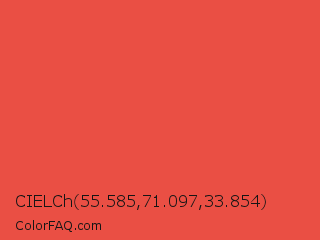 CIELCh 55.585,71.097,33.854 Color is a normal red color and the nearest color is Carmine Pink #eb4c42. Hex code #ea4f44 and RGB value is rgb(234,79,68). In RGB color space, this color is composed of 92% red, 31% green, 27% blue, In CMYK color space, this color is composed of 0% cyan, 66% magenta, 71% yellow , 8% black , In HSL color space, this color has a hue angle of 4° , 80% saturation and 59% lightness.