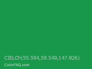 CIELCh 55.594,59.549,147.826 Color is a normal green color and the nearest color is Eucalyptus #278a5b. Hex code #1a994b and RGB value is rgb(26,153,75). In RGB color space, this color is composed of 10% red, 60% green, 29% blue, In CMYK color space, this color is composed of 83% cyan, 0% magenta, 51% yellow , 40% black , In HSL color space, this color has a hue angle of 143° , 71% saturation and 35% lightness.