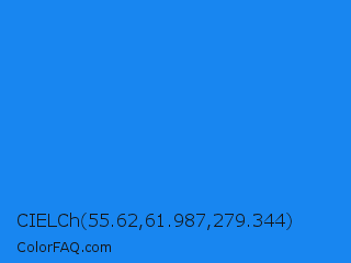 CIELCh 55.62,61.987,279.344 Color is a normal blue color and the nearest color is Dodger Blue #1e90ff. Hex code #1886f0 and RGB value is rgb(24,134,240). In RGB color space, this color is composed of 9% red, 53% green, 94% blue, In CMYK color space, this color is composed of 90% cyan, 44% magenta, 0% yellow , 6% black , In HSL color space, this color has a hue angle of 209° , 88% saturation and 52% lightness.